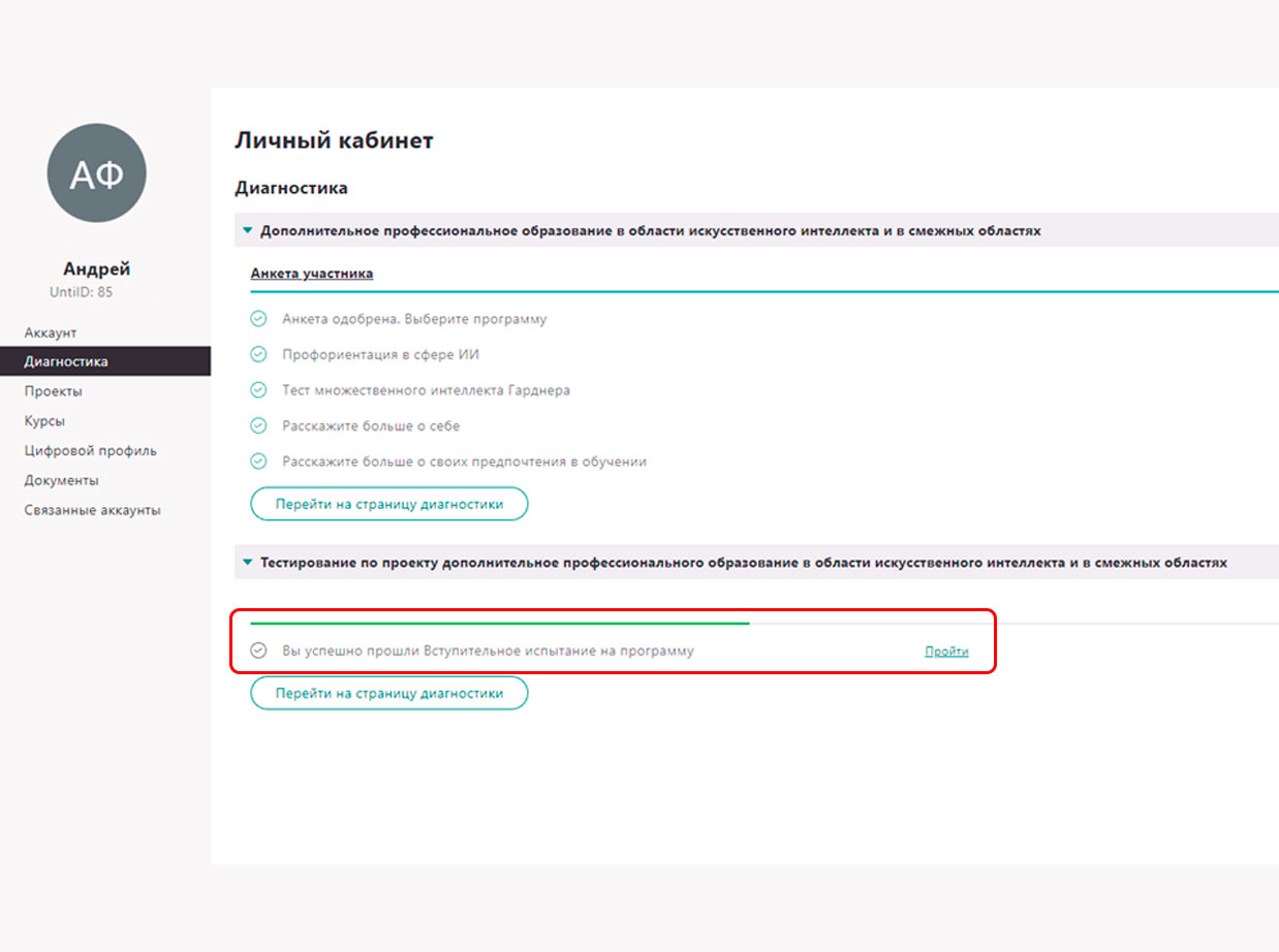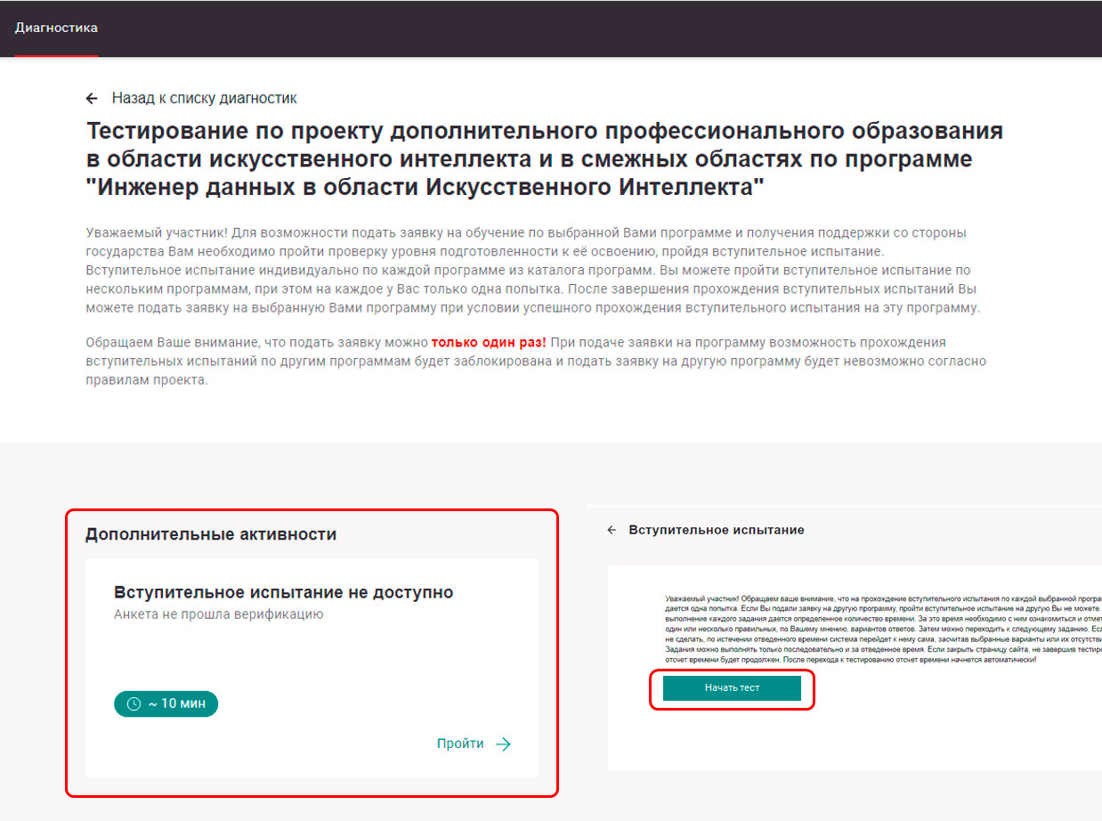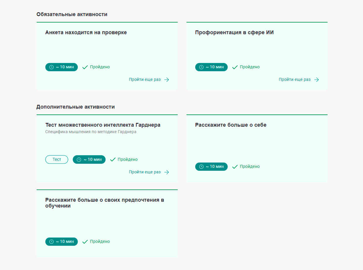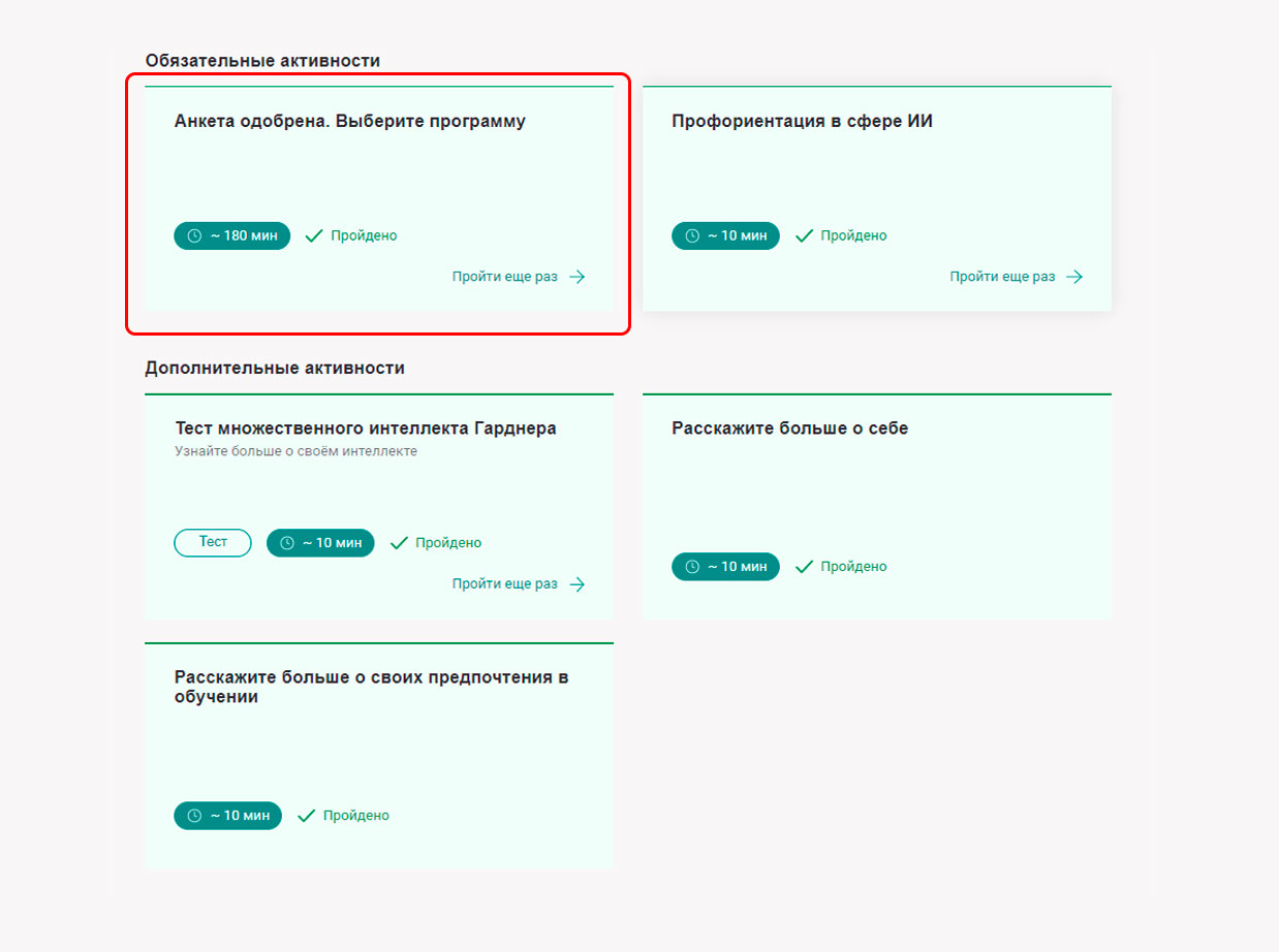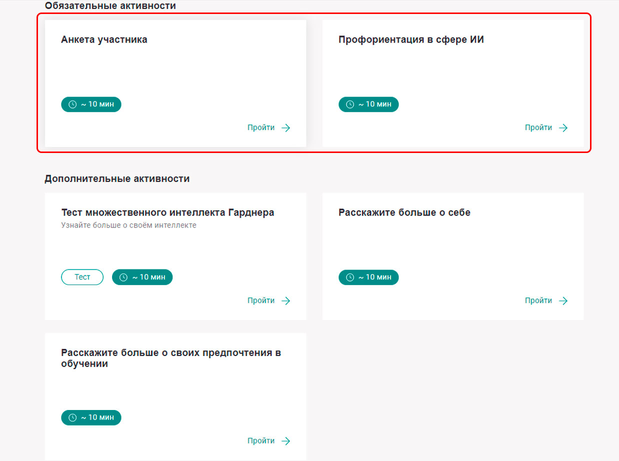 Выполните обязательные активности: заполните «Анкету участника» и пройдите диагностику «Профориентация в сфере ИИ»