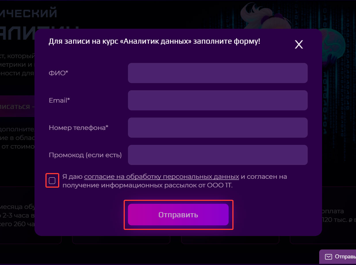 Затем поставьте галочку о согласии на обработку персональных данных и нажмите «Отправить».